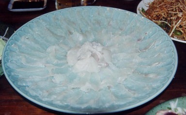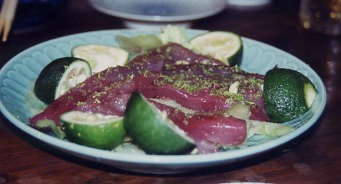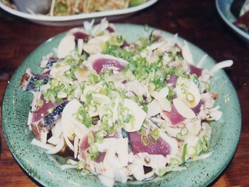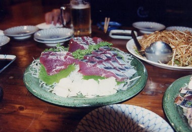 | 大奮発のひらめ一匹盛り!うまかった〜 | これは通称 新子(しんこ) 一般名 丸ソーダカツオの1年もの?(今年生まれたものです。) 1年以上経つと血の臭いが強くなり、かなり血抜きしないと美味しく食べられませんが今年モノはああ言う風に男節、女節ごとの刺身にします。いい時期に来ましたね。季節限定品です。 (解説:和田@高知さん) |